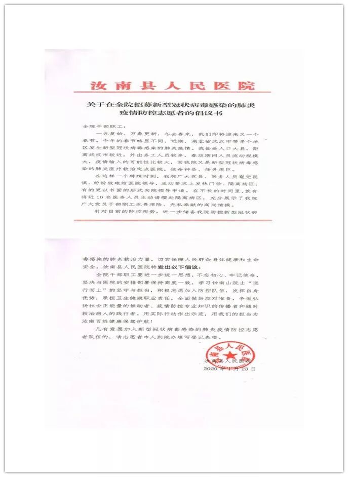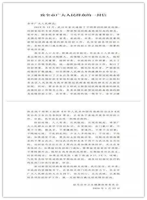 1月22日,市卫健体委面对疫情发出《致全市广大人民群众的一封信》的倡议书,更加坚定了天中百姓与全国人民协力同心、众志成城,打赢这场疫情防控战的决心。
