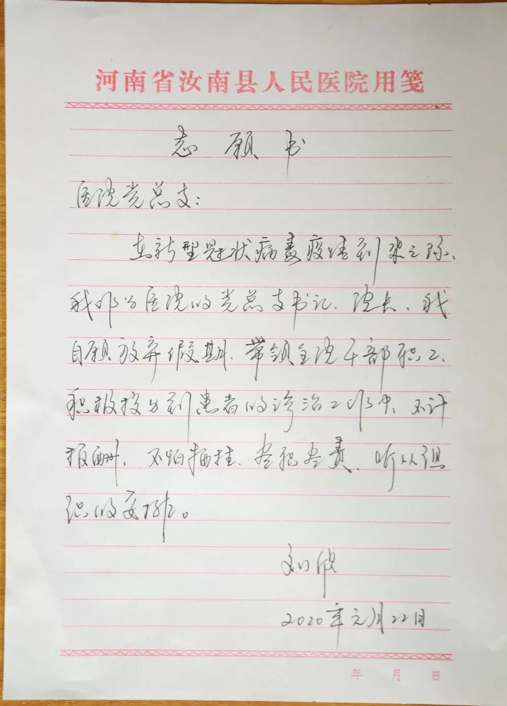 当日,刘院长向党总支递交上志愿书:“我自愿放弃假期,带领全院干部职工积极投身患者的诊治工作中,不计报酬、不怕牺牲、尽职尽责,听从组织安排!”