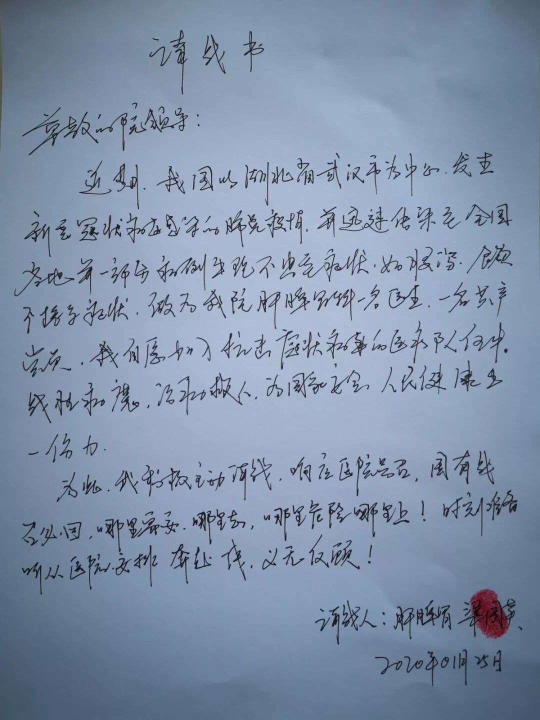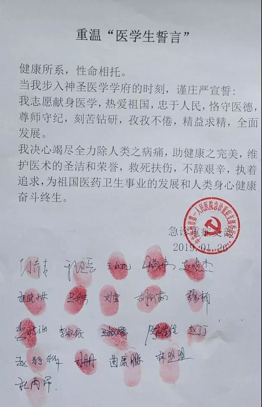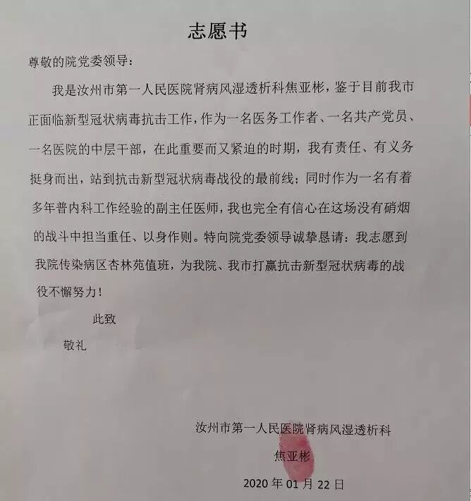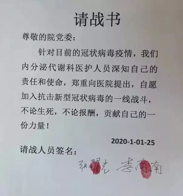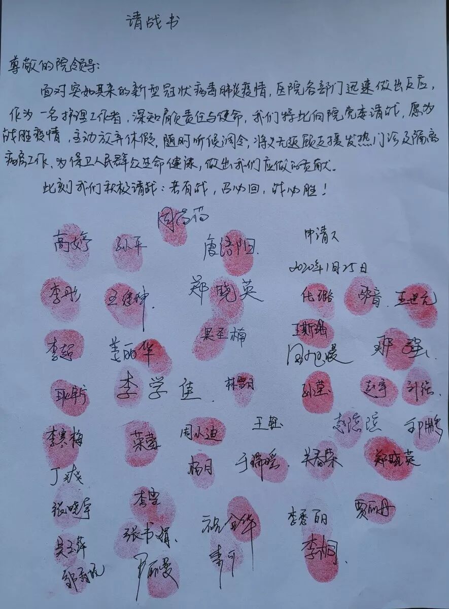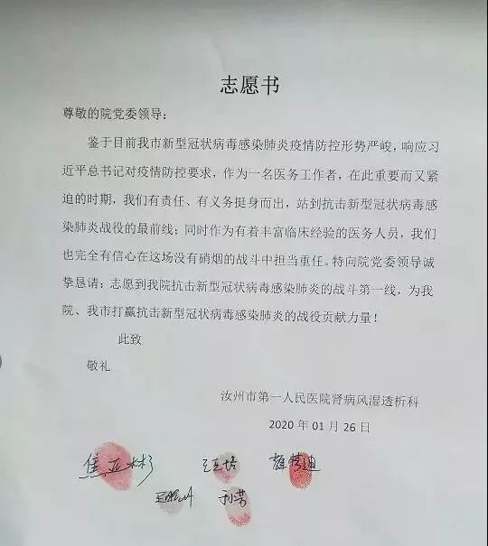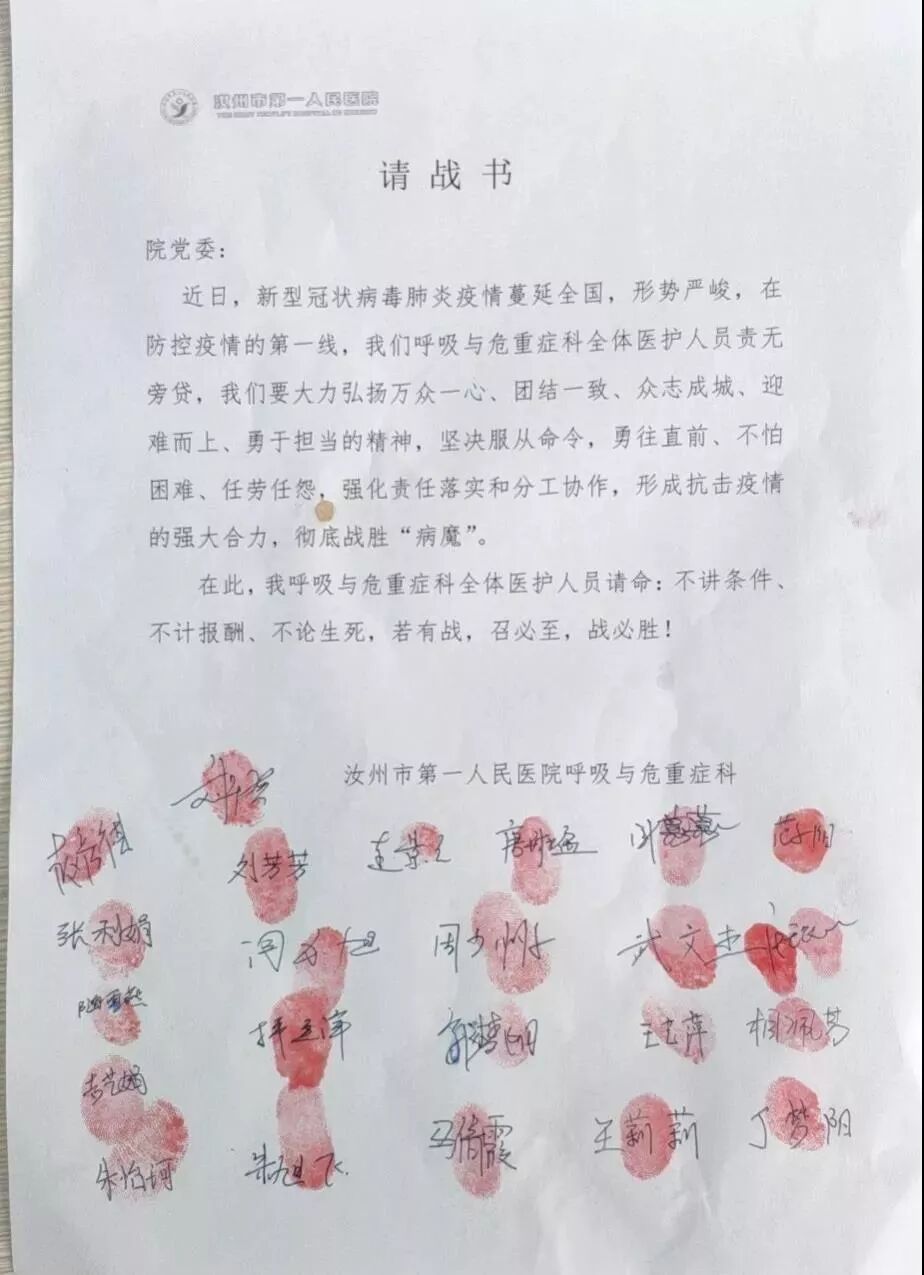 这是1月26日,汝州市第一人民医院全体医护人员向医院党委递交的请战书。一个个签名按下的鲜红手印,折射出的,是白衣战士救死扶伤的责任与担当!