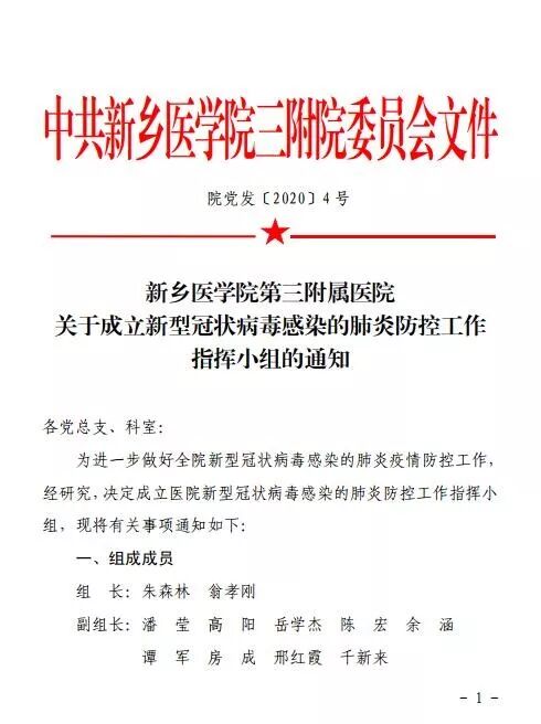 医院应急医疗队6名医护人员出征新乡市传染病医院驰援抗击新型冠状病毒感染的肺炎疫情,根据应急医疗队申请,医院党委批准成立应急医疗队临时党支部。