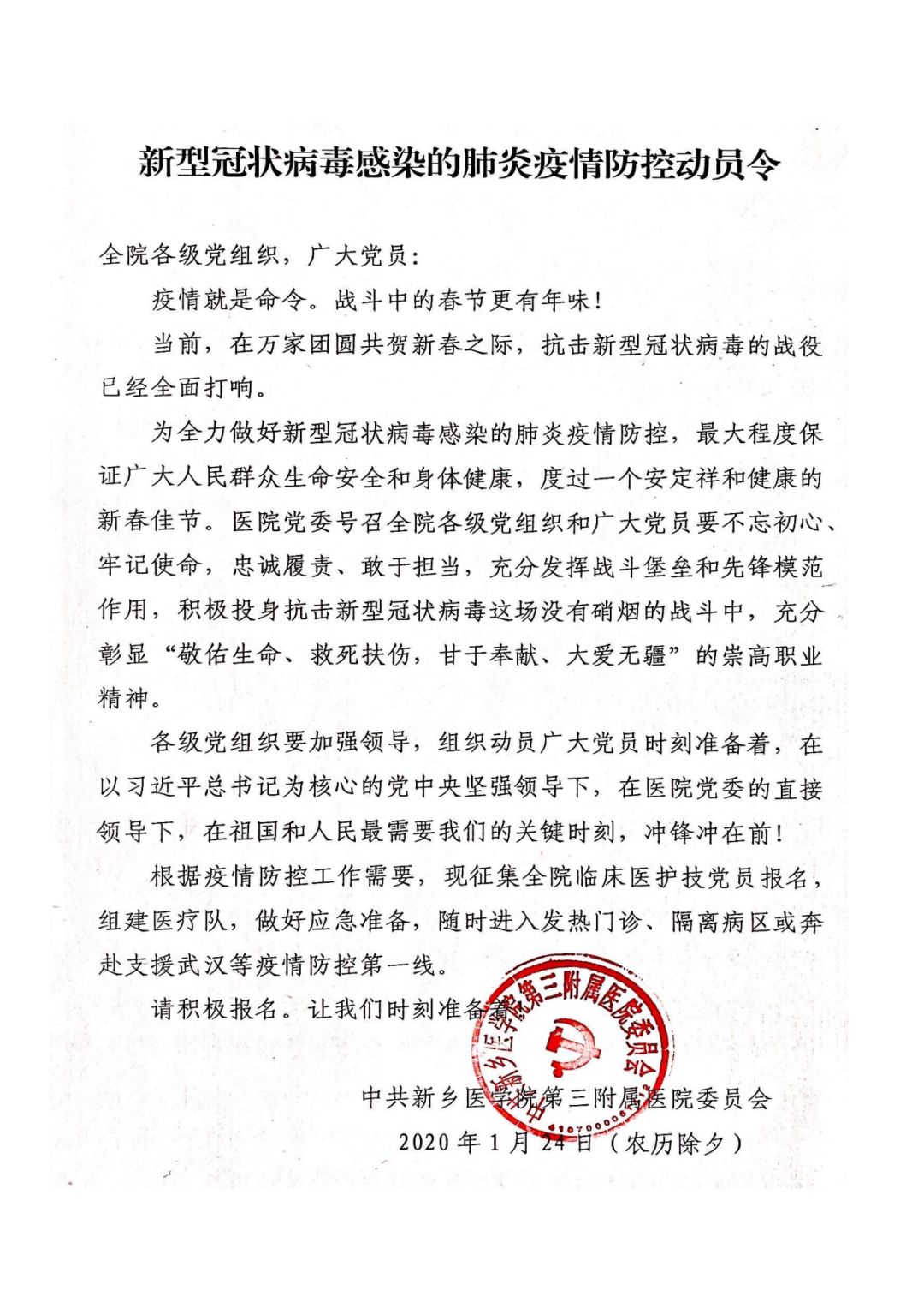 医院党委向全院发布《新型冠状病毒感染的肺炎疫情防控动员令》,号召全院各级党组织和广大党员充分发挥战斗堡垒和先锋模范作用,让党旗在防控疫情斗争第一线高高飘扬!