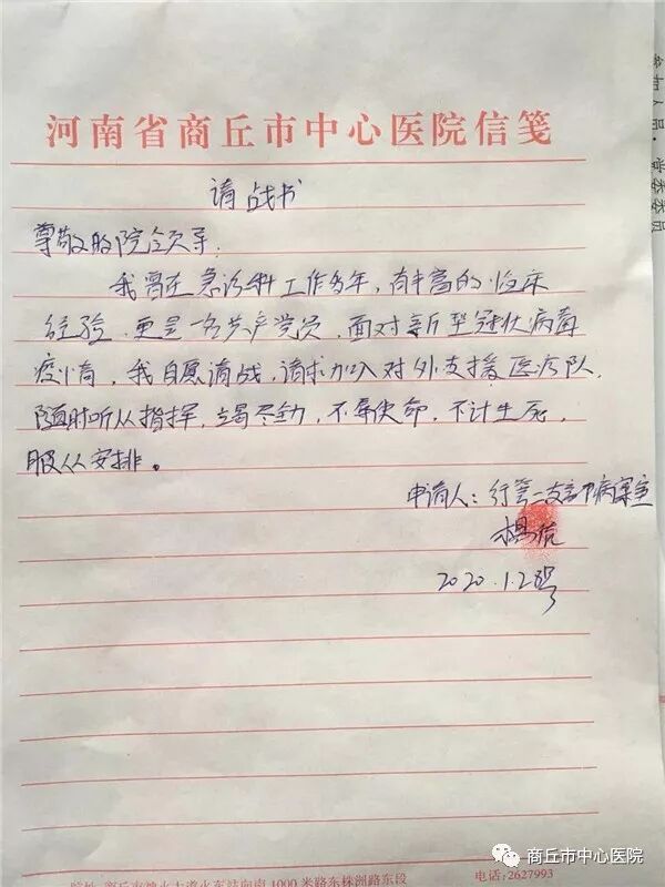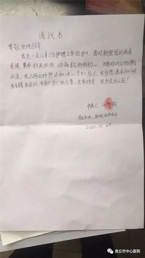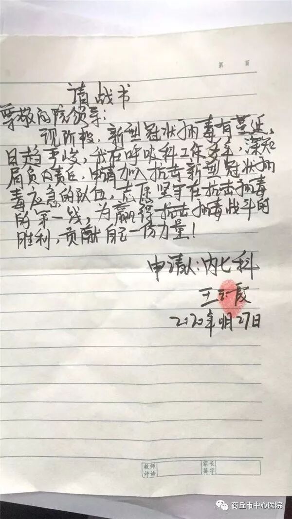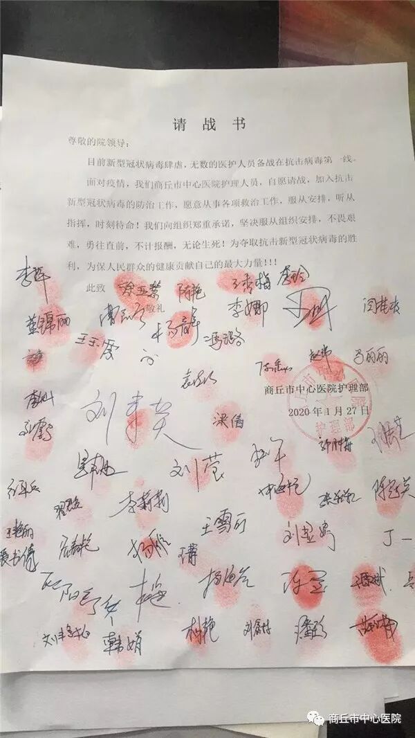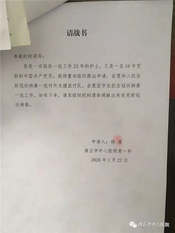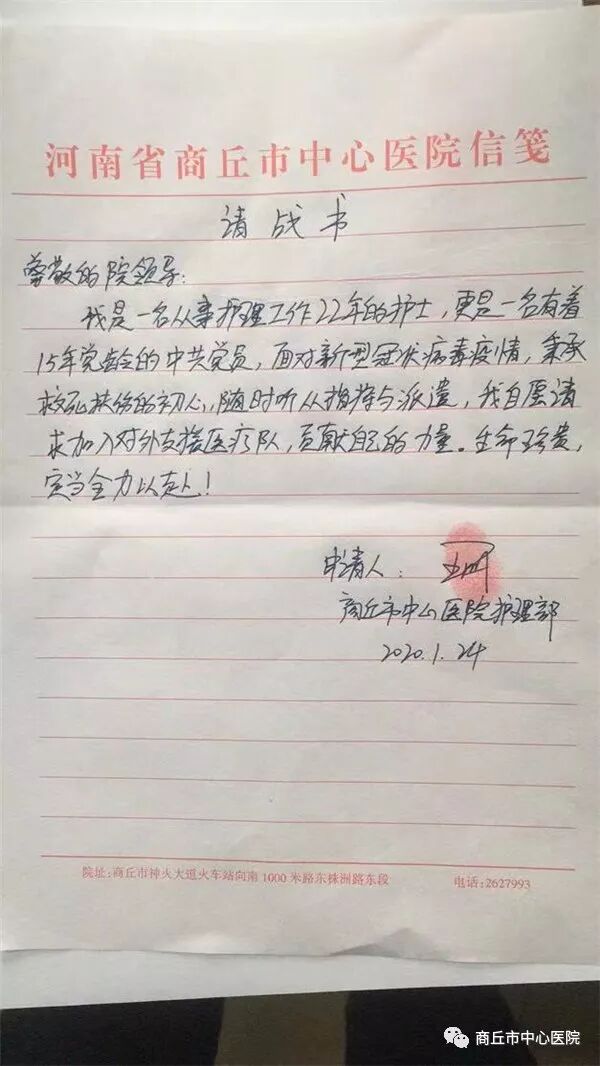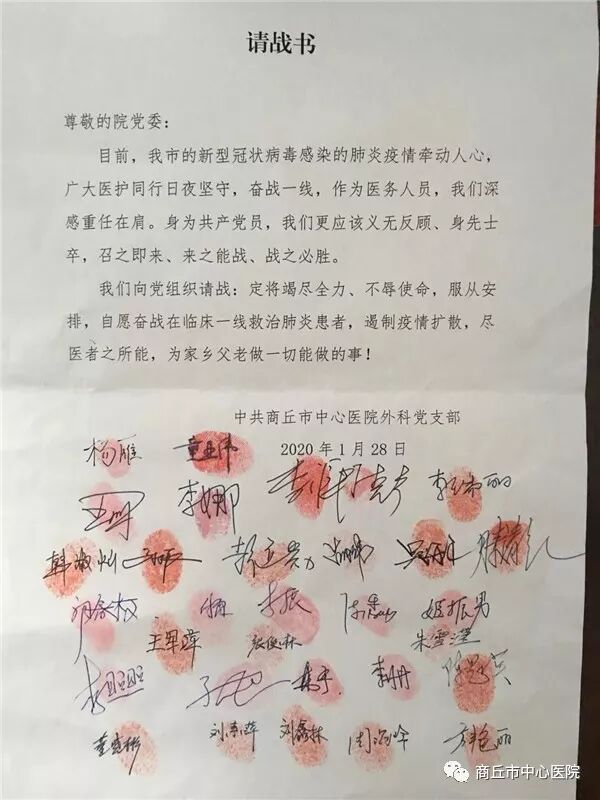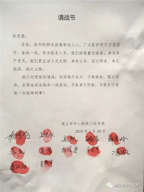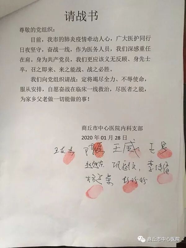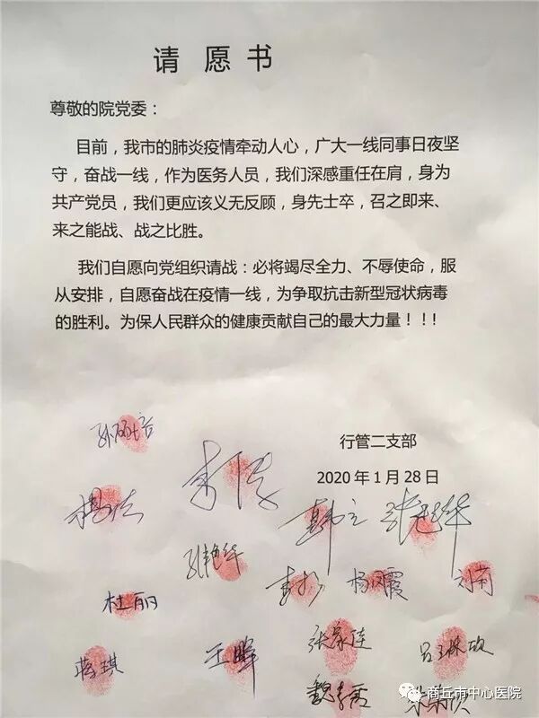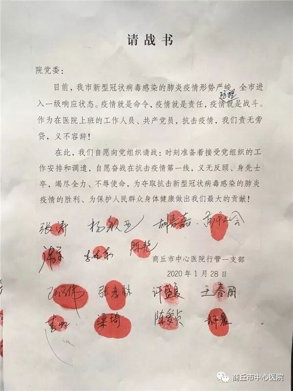 商丘市中心医院党员请战抗击防控疫情战役一线