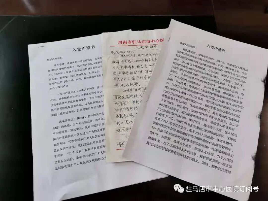最令人感动的还有我们的医护人员,抗击新型冠状病毒感染肺炎任务下达后,在短短几十分钟的时间内,医院便从志愿者中挑选组建出第一批医护队伍支援发热门诊和病区,第一梯队成员全部是素质过硬、业务精湛的共产党员。同时医院上下已做好充分的思想准备,打大仗、打苦仗、打硬仗,第二、第三批志愿者队伍已组建完毕,后续批次志愿者队伍正在组建中,所有后续梯队成员优先从党员、团员和入党积极分子中挑选。很多人舍小家为大家,克服家庭和自身的种种困难,主动请缨、争上一线,在这种氛围的感召下,正在一线抗击疫情的医护人员丁华永、李敏、秦丽珍、南宁四名同志向党组织递交入党申请书,请求火线入党,接受党组织考验。