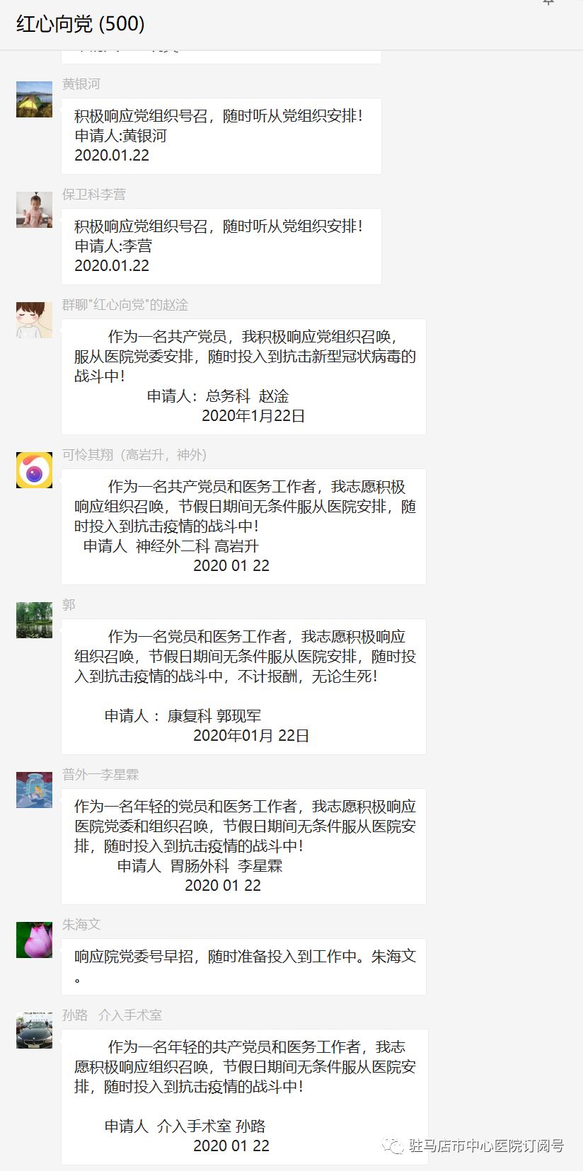 据不完全统计,在短短的半天时间内,医院千余名医护人员纷纷向医院党委、党支部或科室递交“志愿书”,表示随时听从组织的召唤,时刻准备战斗,投身抗击病毒、抢救生命的最前沿,以大无畏的精神和义无反顾的决心,捍卫白衣天使的职责、使命与荣耀。这其中党员、团员占请战人员的三分之二以上。共产党人是这样说的,也是这样做的。疫情发生至今,医院党委及全体班子成员一刻也没有休息,整个春节期间全部坚守在岗。疫情防控救治领导小组办公室主任张志韧同志,严格按照一名共产党员的标准要求自己,疫情发生以来,他协调处置各方事宜,连续多日不分昼夜的坚守在抗击疫情第一线。