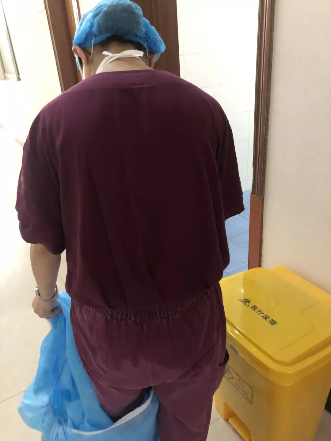 穿防护服工作了5个多小时的感染性疾病科护士,脱去防护装备后汗水浸湿了整个后背……
