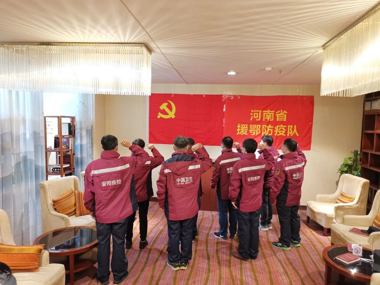 抵达武汉后,有着党务工作经历的他,积极参与临时党支部的筹建工作,并被任命为河南省第二批支援湖北防疫队临时党支部宣传委员,与队员们一起将驻地楼层的一处闲置空间变成了党员组织活动的临时阵地,让鲜红的党旗在疫情防控一线驻地高高飘扬。