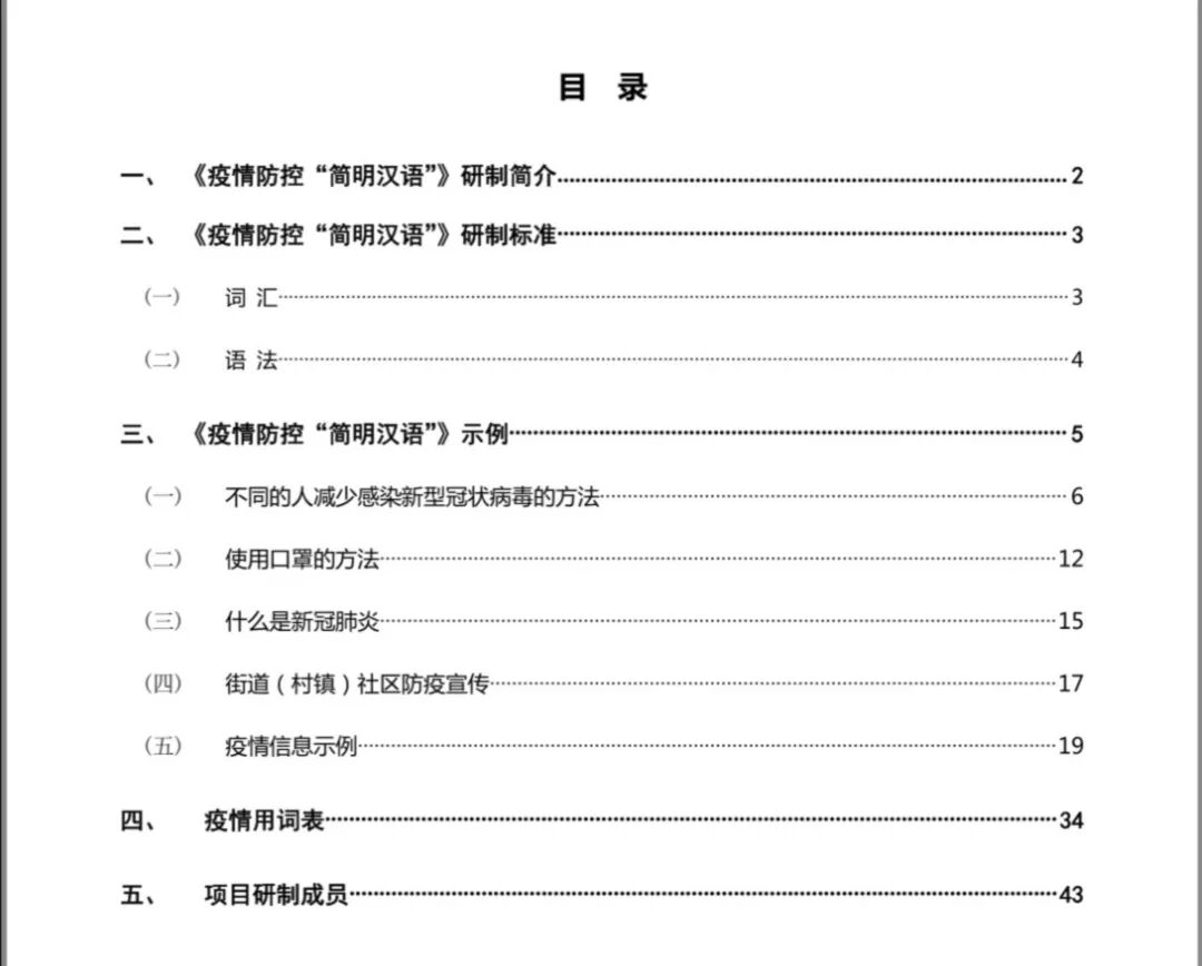 《疫情防控“简明汉语”》是“战疫语言服务团”继《抗击疫情湖北方言通》《疫情防控外语通》之后,为抗击新冠肺炎疫情研制的第三种语言应急产品,首次面向国内推出。《疫情防控“简明汉语”》借鉴国际经验,首先确定为在华外籍人士提供的新冠肺炎疫情信息内容,然后根据反复简化试验确定“简明汉语”的研制标准,再对信息文本进行简化。