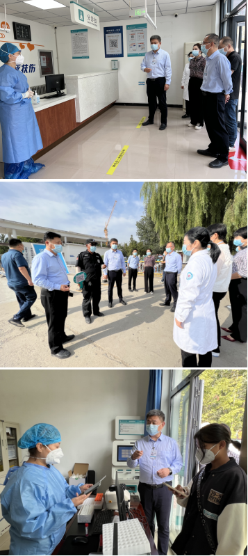 崔建国书记一行首先深入医院预检分诊、发热门诊、门口处等重点关口,并现场提问工作人员和保安关于人员进出的疫情防控政策与规定,并强调,作为新冠肺炎定点救治医院,要全面落实疫情防控要求,紧盯重点区域和薄弱环节,抓实抓细疫情防控各项工作,确保医院在国庆期间疫情防控工作更加严谨。