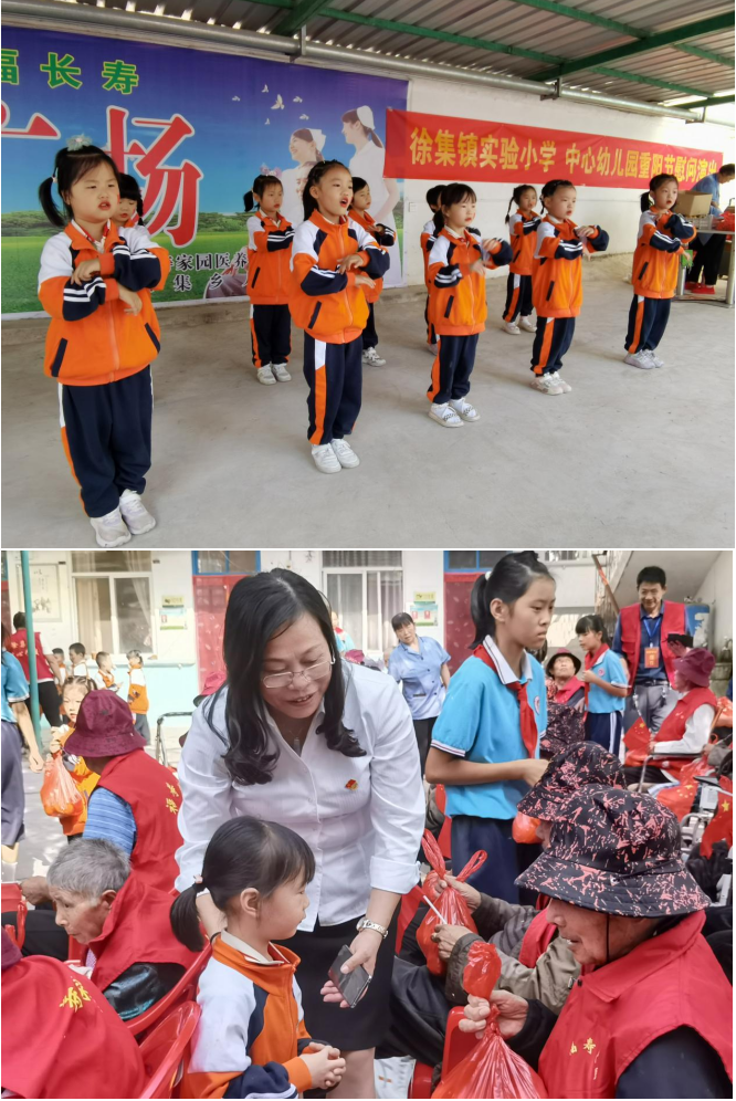 徐集镇中心校校长周士慧简短致辞后,孩子们把精心准备的节目依次推出。幼儿园小朋友带来的舞蹈《篮球场》、手指舞《百善孝为先》《爱上幼儿园》,宋欣怡、丁月等同学表演的《你笑起来真好看》等节目,虽然稚嫩但充满童心,让台下的老人看得笑出了眼泪。汪甜甜和陶胜楠老师带来的诗朗诵《岁岁重阳,今又重阳》,深情讲述了重阳节的过去、现在和未来。舞蹈《感到幸福你就拍拍手》,把整场演出推向了高潮。