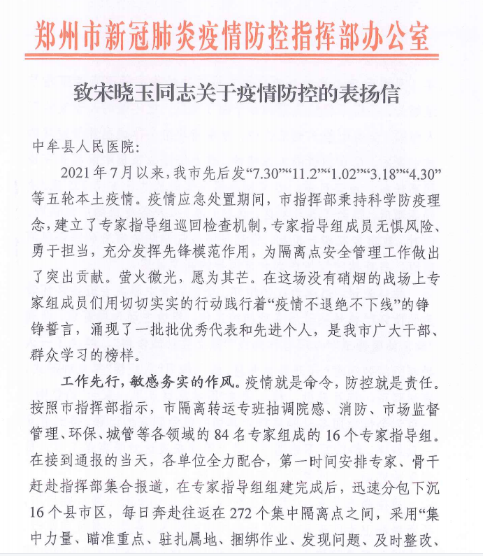近日,郑州市新冠肺炎疫情防控指挥部发出一封《致宋晓玉同志关于疫情防控的表扬信》,表扬信中对中牟县人民医院感控科宋晓玉同志在疫情防控工作中的突出表现给予充分肯定。信中写道:“本轮疫情期间,宋晓玉同志作为专家指导组第十四组组长,以身作则,真抓实干,带领本组成员坚守阵地。”
