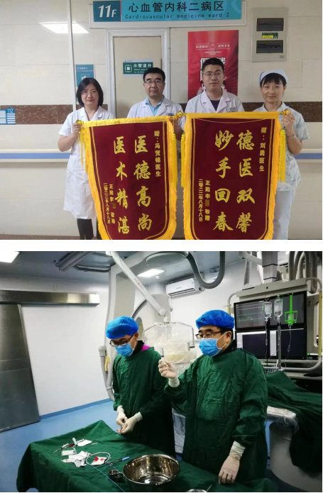 6月13日,对于患者刘某来说是痛苦难忘的,他回忆道,“那天中午他午休时突然出现胸痛、胸闷、大汗,下床后突然晕厥,醒了之后就赶紧联系同事,同事立即把他送到了确山县人民医院急诊科胸痛中心,接诊医生立即行心电图检查,并第一时间传送至心血管内二科值班医师冯贺锦那里,接到胸痛中心传来的心电图后,冯医师立即做出诊断:“急性下壁心肌梗死”!接下来指导急诊科医生给予患者双抗、肝素、建立静脉通路等抢救措施,同时联系导管室值班人员及刘勇主任和姜东伟副主任,积极术前准备。本着“时间就是生命,时间就是心肌”的治疗原则,刘主任和姜主任在极短的时间内为患者开通了血管,D2W为50分钟(因为患者年轻,沟通时间长),为患者抢救生命赢得了先机。术后患者得到了心内二科全体医护人员的无微不至的关心和照顾,他们的付出让死里逃生的刘某倍感温暖,特此锦旗两面相赠。