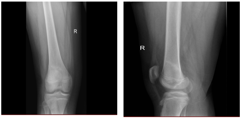 图1:男,14岁,蛙跳后右膝关节疼痛半月余。右膝关节正侧位X线平片显示股骨远端细带状骨质密度增高影。