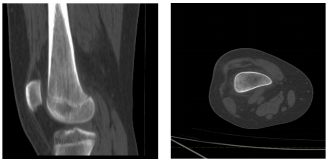 图2:与图1为同一患者,CT显示右侧股骨远端局部骨质密度增高并见模糊线样横行透亮线。