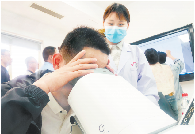6月16日,在宝丰县医疗健康集团周庄镇分院(周庄镇卫生院),医务人员正在用眼底照相机为村民进行慢性病健康检查。通过眼底拍照,能够及时、准确发现糖尿病患者身体中的危险因素,预防并发症的发生。 据了解,为扎实做好高血压病、糖尿 病、脑卒中、慢性阻塞性肺病、冠心病、慢性肾炎6种慢性病患者的集中管理,该院率先成立了“慢性病健康管理工作站”,通过智能化的检查设备,以及“红色、黄色、绿色”3 种色标,帮助患者提前进行疾病筛查、健康干预、动态管理和分级诊疗。 王 平 周军辉/摄