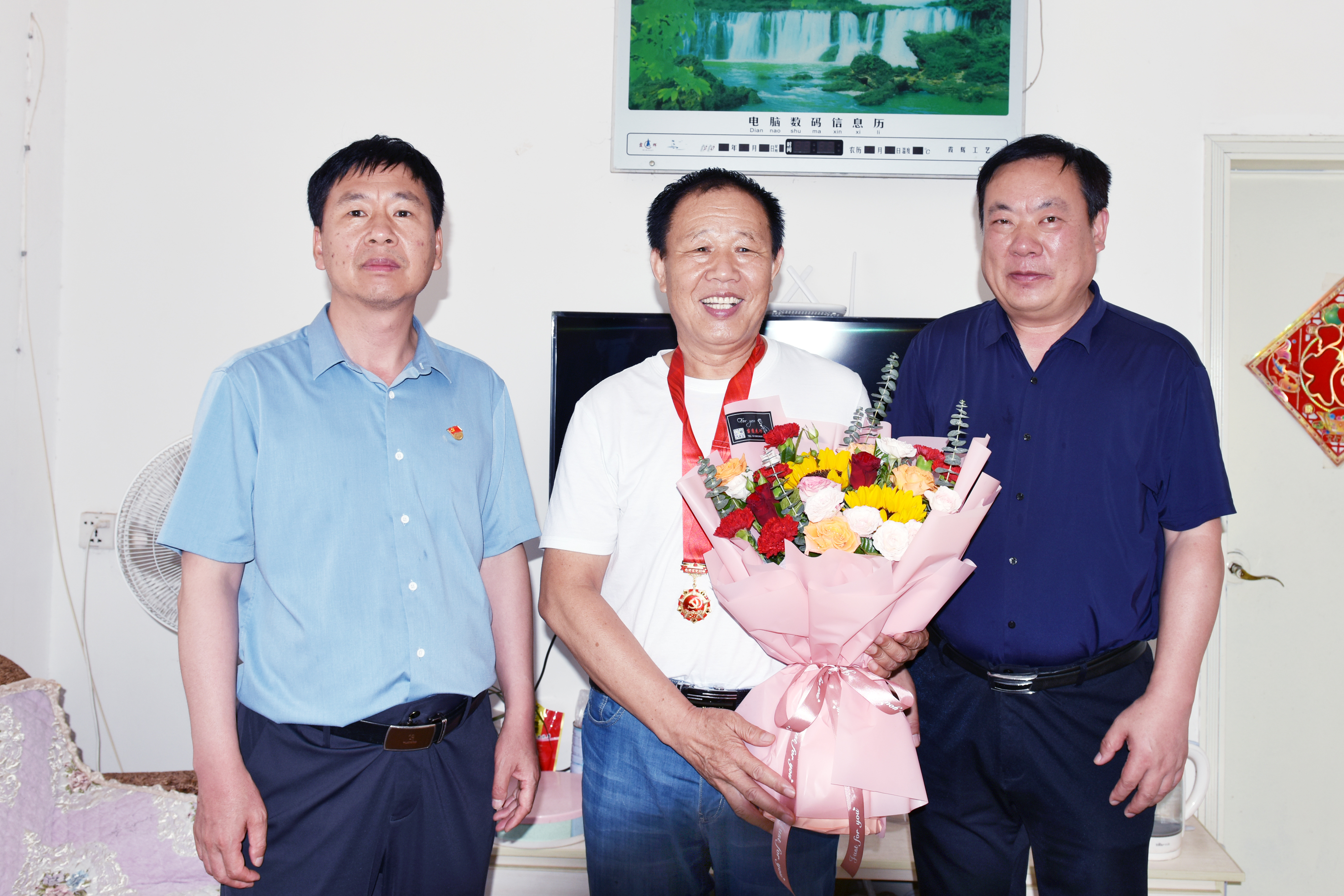 在50周年党龄的退休老党员王荣贵家中,朱迎民和花建伟为他颁发了“光荣在党50年”纪念章,并送上鲜花和慰问金。现场,老人激动万分,与大家畅谈热爱党、热爱祖国的内心真实感情。当天院离退休党支部工作人员还深入科室看望慰问部分党员,带去了党组织的关心和问候。