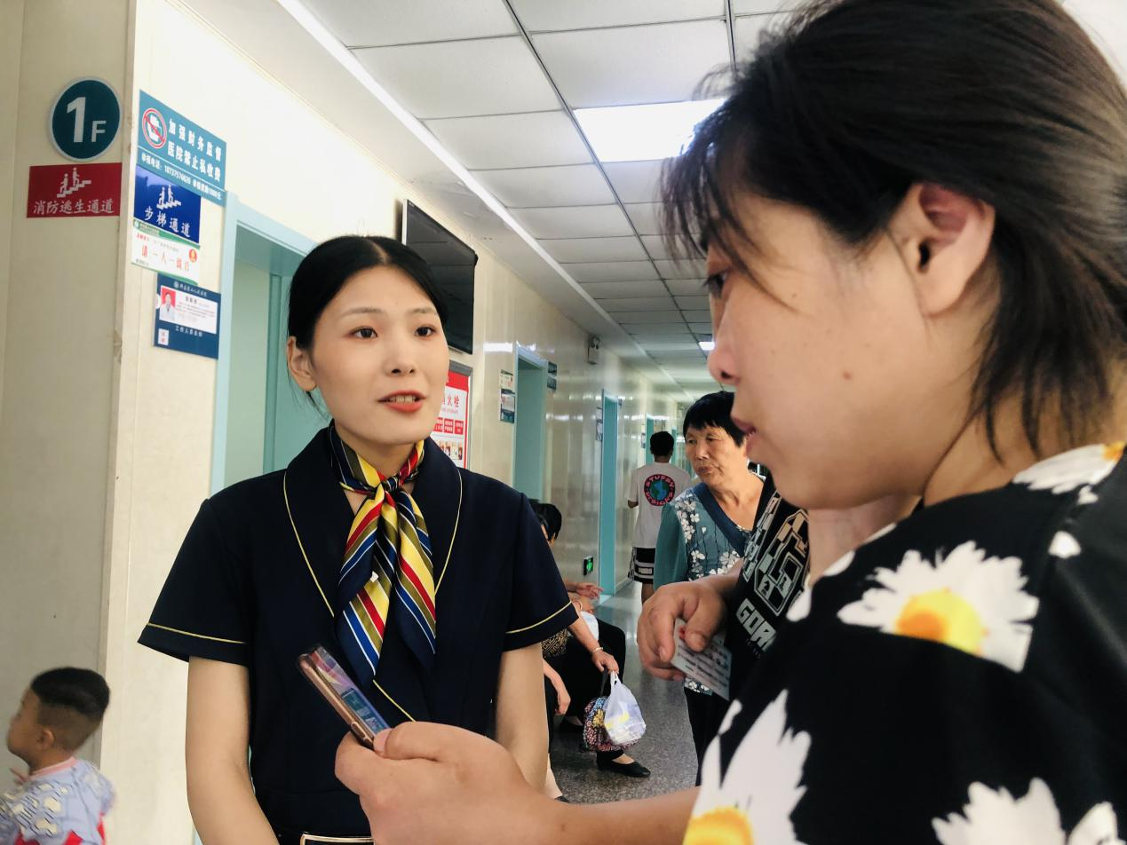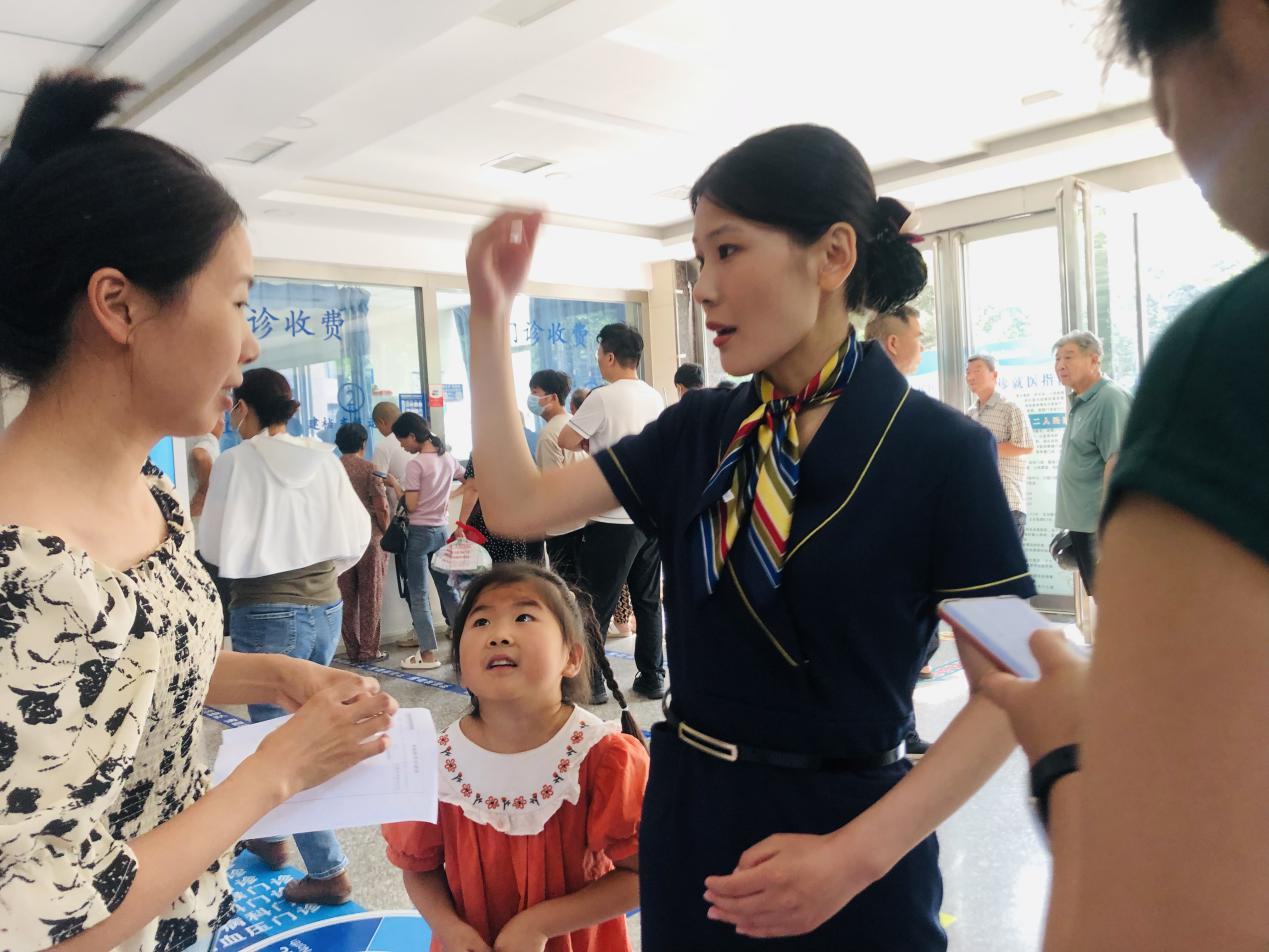 7月2日,一位身着“空姐”服装的护士申晓凡在为患者做热情的就医向导。据了解,为营造文化氛围,提升服务能力,近日,郏县第二人民医院面向社会公开选拔一批有气质、有素质、知识全面的“空姐”护士作为医疗服务窗口的形象“代言人”。目前,该院以申晓凡为形象代表的一批“空姐”护士服务团队,通过形体训练和专业知识培训,并分别安排到门诊以及病房等服务窗口,为患者提供全面的优质服务,此举深受患者及患者家属好评。