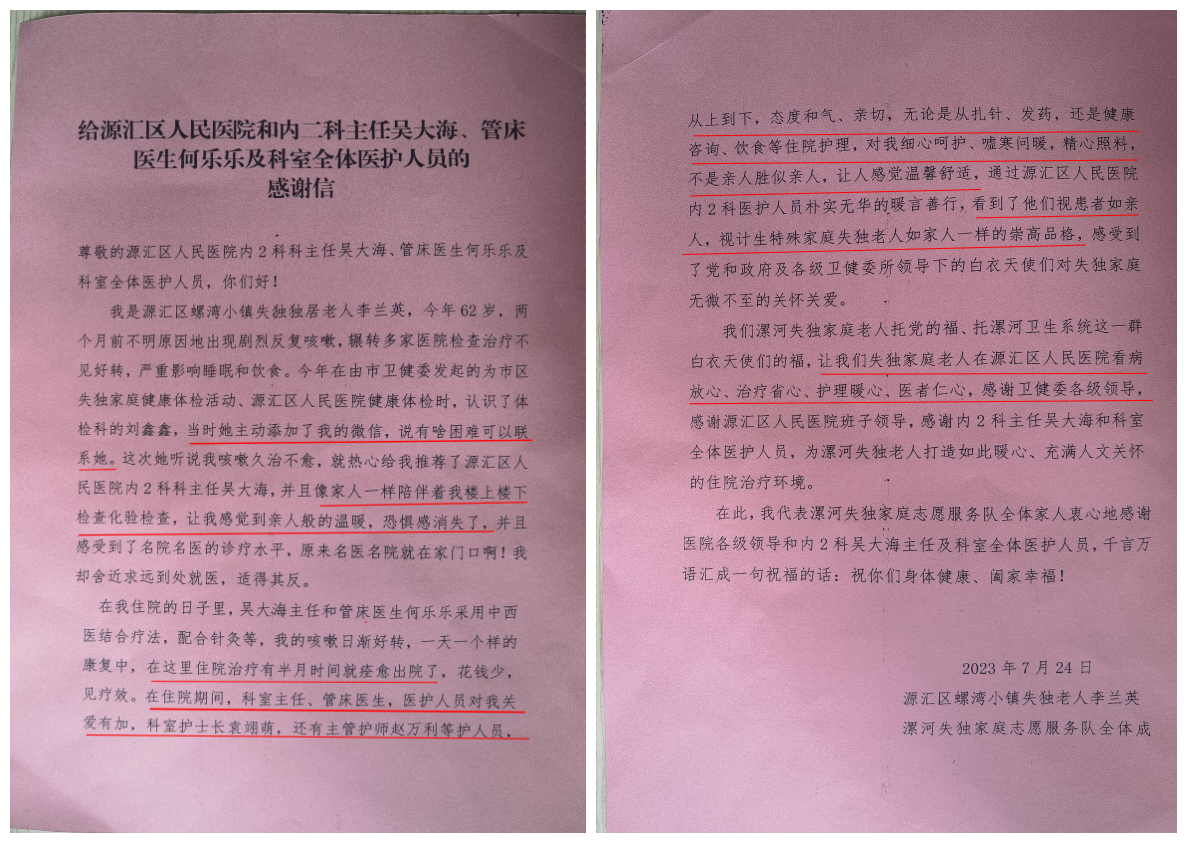 该院体检科的人员不仅热情接待了李女士,全程一对一陪伴体检,还主动留下联系方式,并将体检结果送到李女士家中。在体检后电话关爱服务中,体检科主任刘鑫鑫得知李女士咳嗽久治不愈,向她热心推荐了医生,经过一段住院治疗,李女士痊愈了,她写下这样一封感谢信。