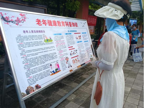 活动通过悬挂横幅、设立咨询台、摆放宣传展板、发放小礼品等形式开展,志愿者们用通俗易懂的语言讲述了老年人日常健康管理、老年人常见病、中医药健康管理、老年健康服务以及推广老年人科学运动技能等方面健康知识和政策。医务人员满头大汗地为老年人提供血压、血糖测量、眼科检查等暖心服务。“您的血压较高,又有糖尿病,平时一定要注意合理饮食,抗高血压的药物一定要按时服用啊!”