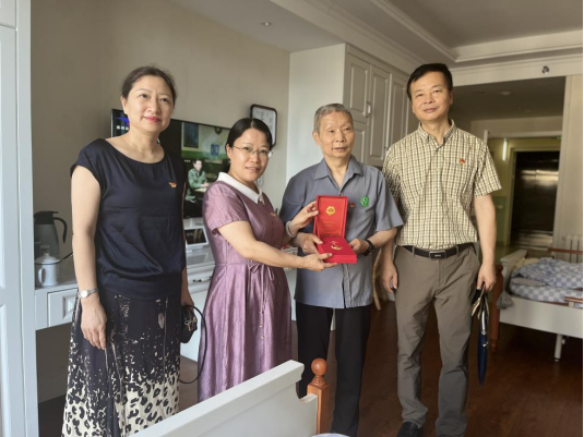 在圣德医院养老中心,张丽一行3人慰问退伍军人邵江照,询问他的健康状况和生活中存在的困难,为他送去慰问金500元,并颁发了“光荣在党50年”纪念章。