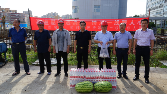 商城县人民医院党委书记、院长王卫,工会主席何卫国,120急救指挥中心主任杨绪德,副院长丁楠,分管安全生产工作的主任雷泉一行来到医院建造项目工地及该院人居环境整治分包网格,为炎炎夏日坚守岗位的一线职工送上防暑降温清凉物资,让职工们深切感受到来自党和工会组织的关心关爱。