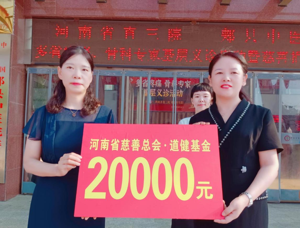 据了解,此次大型健康义诊活动,由河南省直第三人民医院主办,郏县中医院承办,河南省慈善联合总会•道健基金资助。目的是通过义诊的形式,为群众带来一场全方位、高品质的医疗保健服务,让优质医疗资源下沉基层、惠及群众。在启动仪式上,河南省慈善总会·道健基金会有关负责人向郏县中医院捐赠了20000元的道健基金,用于在此次义诊活动中,被专家确诊需要到河南省直第三人民医院椎间盘中心郏县分中心(在郏县中医院),接受微创治疗的家庭经济困难的住院患者。