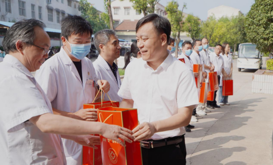 8月14日,在中国医师节来临之际,温县人民医院党委书记、院长杨纪明、纪检书记张绍杰偕相关科室同志,来到该院门诊科室、临床科室,向一线医师们致以节日的祝福。