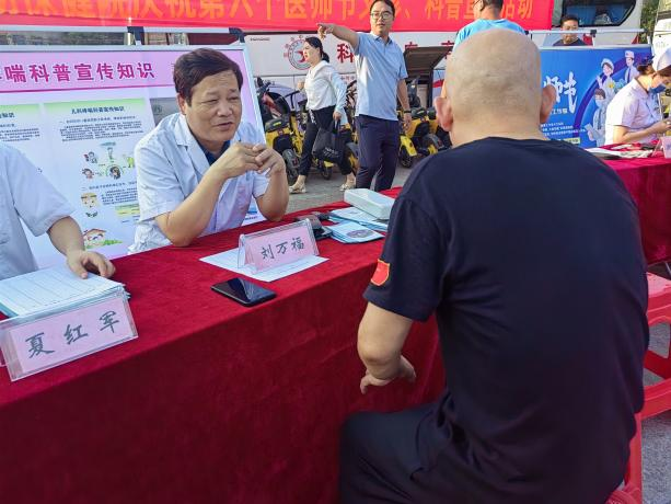据介绍,8月19日一大早,在固始县卫健委组织安排下,该院义诊专家团队成员陶家平、刘万福、张术鑫、沙广娟、冯勇、夏红军、赵姗姗、李长霞等与3名护理人员在固始县陈元光广场开展“庆祝中国第六个医师节”义诊活动。免费为群众测血糖、量血压、发放健康知识资料及疾病疑问解答。此次活动,悬挂条幅1条,健康宣传版面4块,服务患者300余人,健康教育资料5种,约500份。