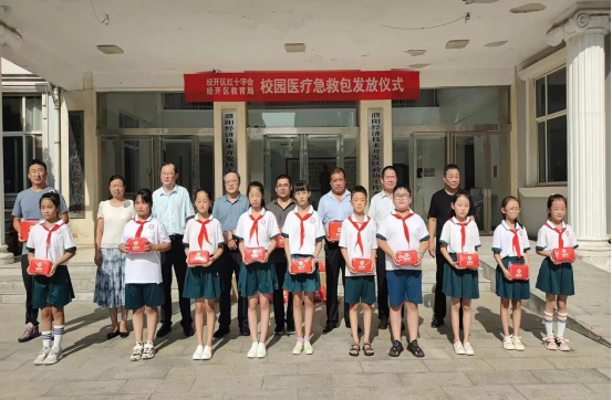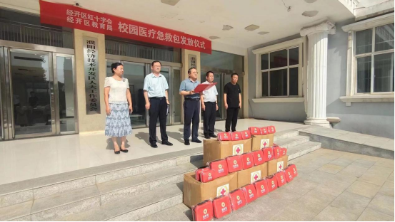 2023-8-24 来源:医药卫生网 - 医药卫生报 浏览:次 【查看证书】本报讯(记者陈述明 通讯员曹丽 李慧峰 刘瑞琴)为进一步提高校园应急救护处置能力,倡导社会急救理念,弘扬“人道、博爱、奉献”的红十字精神。8月22日上午,濮阳经开区红十字会向区教育系统捐赠239个校园急救包,这批急救包将分别设置在区内十八所中小学的班级内应急备用。区党工委委员武国体、区红十字会、区卫生局、区教育局及学校领导、校医和学生代表参加了本次捐赠仪式。