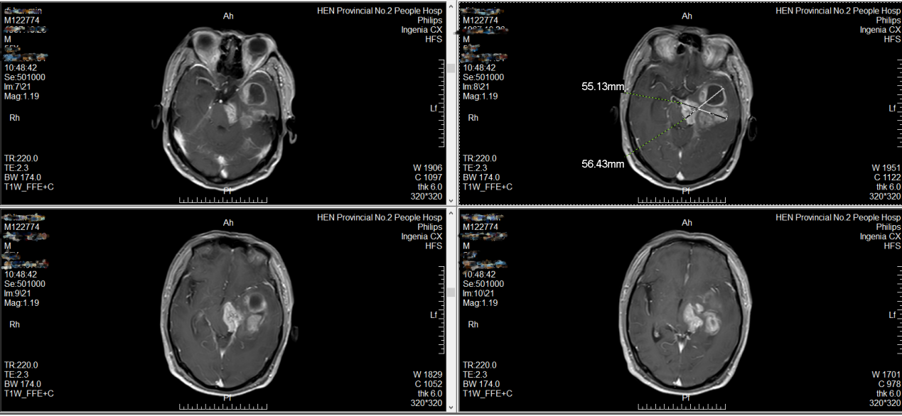 该院神经外科主任、主任医师周玉璞结合检查结果发现,患者不完全失语,右侧面瘫,右侧肢体轻偏瘫;核磁共振检查显示:左侧颞叶及左侧丘脑、左侧基底节区多发占位,肿瘤侵犯脑干,脑干及小脑幕切迹区受压明显,肿瘤大小约为55mm×56mm×56mm。周玉璞当即诊断患者罹患胶质瘤可能性大。