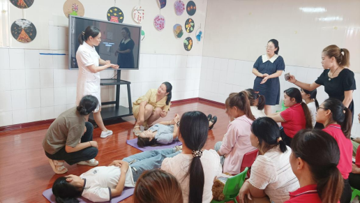 陈艳辉为大家讲解了不同年龄、不同情况下海姆立克急救法和心肺复苏急救技术的操作要点,并进行了现场演示。演示结束后,大家积极参与体验,在靳燕霞主任和陈艳辉护士长的耐心指导下,运用刚刚学到的急救知识,进行心肺复苏及海姆立克急救法的模拟实操。