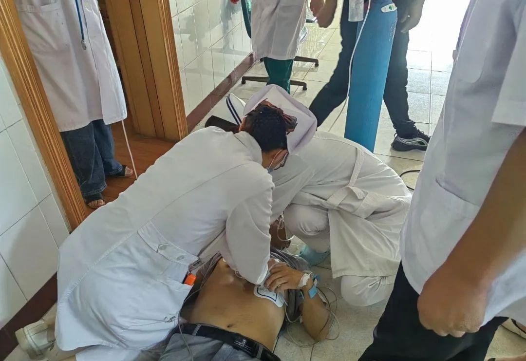 在2分钟内,汇聚了全院内、外、护、技等多科室人员到位,在不间断胸外心脏按压的同时,氧气吸入、心电监护、打开静脉通道等工作同时开展……经过20分钟的抢救,患者呼吸、心跳恢复,将患者转入抢救室,张某某又出现心跳骤停,意识丧失,瞳孔散大,如此紧急情况,大家并未放弃,持续胸外按压抢救工作并与县医共体总院对接。