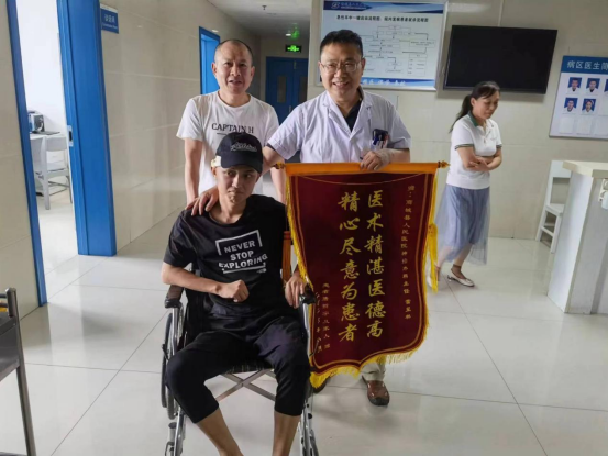 经过2小时的紧张奋战,术中清除患者颞顶部硬膜外血肿约30ml,清除硬膜下血肿40ml,患者术后双侧瞳孔恢复等大等圆,带气管插管并呼吸气囊,送往重症医学科继续生命支持治疗。8月5日8时50分,患者神志恢复清醒,生命体征平稳,转入神经外科普通病房继续对症支持治疗。在神经外科、急诊医学科、手术室、重症医学科的紧密配合下,经过医护人员的精心治疗和护理,8月16日,患者病情好转,顺利康复出院。患者及家属对治疗效果非常满意,复诊时特地赠送一面锦旗以示感谢,“没想到一次意外,竟然与死神擦肩而过,受了这么重的伤也能恢复得这么快,真的太感谢县人民医院的医生和护士了!”