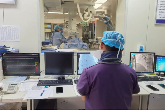 立即启动导管室,行冠脉造影示前降支近段100%闭塞,予植入支架1枚,患者症状明显缓解,在医护人员的护送下返回病房继续治疗,积极给予抗栓,他汀,改善心功能等治疗,在家属跟医护人员的共同努力下,患者病情逐步稳定。这样的生死营救每天都可能在心血管内科“上演”,日复一日,年复一年,驻马店市第一人民医院心血管内科这支“特种兵”团队始终团结一致,快速反应,全力以赴,为天中百姓的生命健康保驾护航。