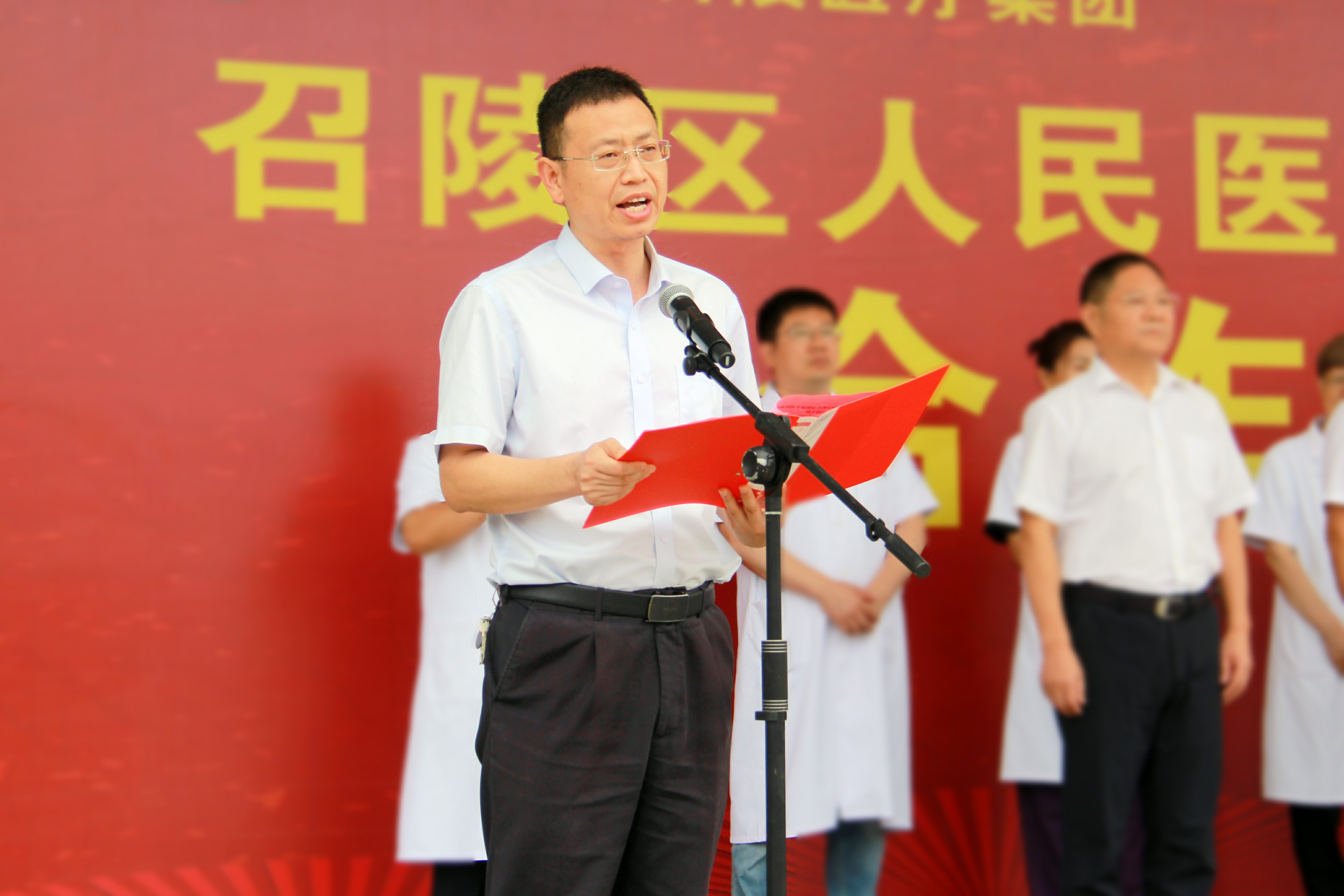来自北京协和医院、北京大学人民医院、中国医学科学院肿瘤医院、中日友好医院、北京医院、北京朝阳医院、北京安贞医院、北京宣武医院的10名知名三甲医院专家,漯河市卫健委副主任吴朝文,召陵区委副书记、区长史耀星,召陵区委常委、区委办公室主任陈新阳,召陵区人大副主任董海权,召陵区政协副主席应旭初,召陵区卫健委党组书记、主任王宇杰,召陵区人民医院党委书记李永昌,区政府办公室主任张献刚,区委办公室、区委宣传部、区委编办、区总工会、区妇联、区残联、区民政、区财政、区人社局、区医保局等单位分管负责同志,以及召陵区医疗机构代表400余人参加合作揭牌仪式。