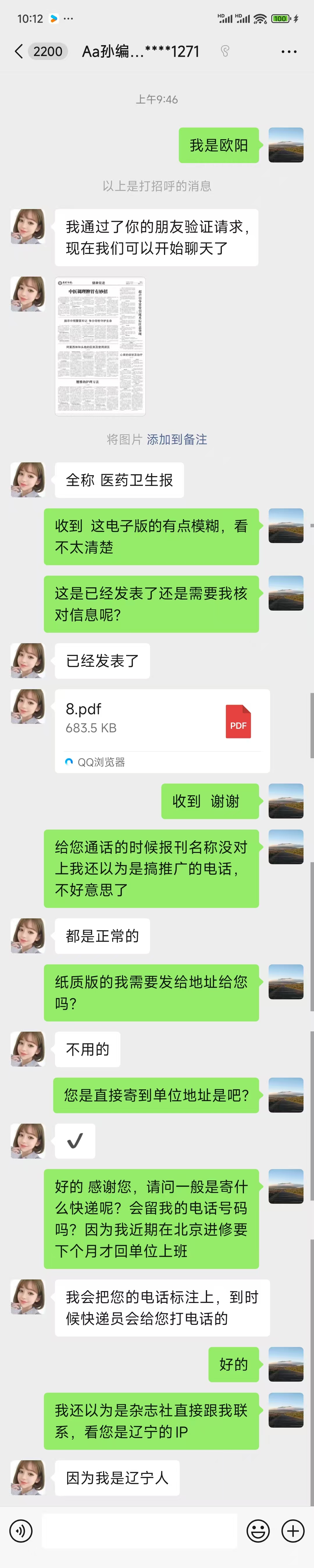近期,医药卫生报社接到多起作者投诉,有人利用《医药卫生报》刊发的文章以发网址或发表证书的形式,频繁向作者联系并加微信。