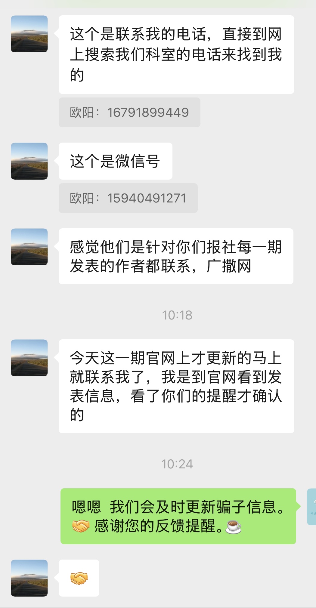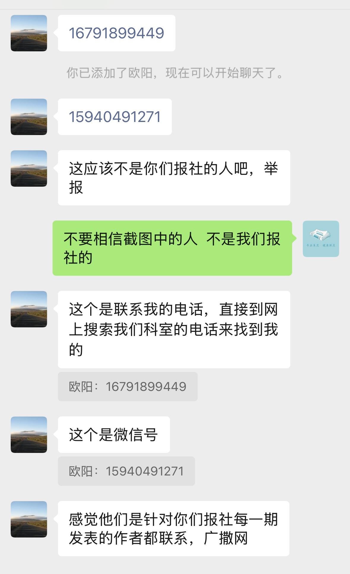 医药卫生报社声明,以下人员非医药卫生报社人员,报社也不会以发网址和证书的形式和作者联系,请作者注意甄别,谨防上当受骗!