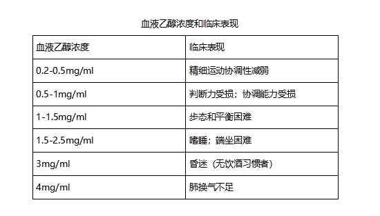 乙醇中毒的症状和体征差别较大,取决于以下因素:患者的遗传因素;摄入乙醇的类型、总量和速率;饮酒的频率和模式。对于非频繁饮酒者,乙醇中毒的临床效应更易预测。相反,患者有长期饮酒史时更无法预测醉酒的影响,此类患者即使BAC(血液酒精浓度,blood alcohol concentration)>4 mg/ml(88mmol/L),也几乎没有乙醇中毒的临床症状[1]。急性乙醇中毒的症状和体征不固定,包括言语不清、眼球震颤、去抑制行为、共济失调、不稳定步态、记忆障碍、昏睡或昏迷,还可能因乙醇所致周围血管扩张或容量丢失而发生低血压和心动过速。还可引起多种代谢紊乱,包括低血糖、高乳酸血症、低钾血症、低镁血症、低钙血症和低磷血症。急性过量时的乙醇清除率通常始终保持恒定,乙醇不耐受者清除速度为每小时0.1~0.25mg/ml;长期饮酒者的清除速率可高达每小时0.3mg/ml。