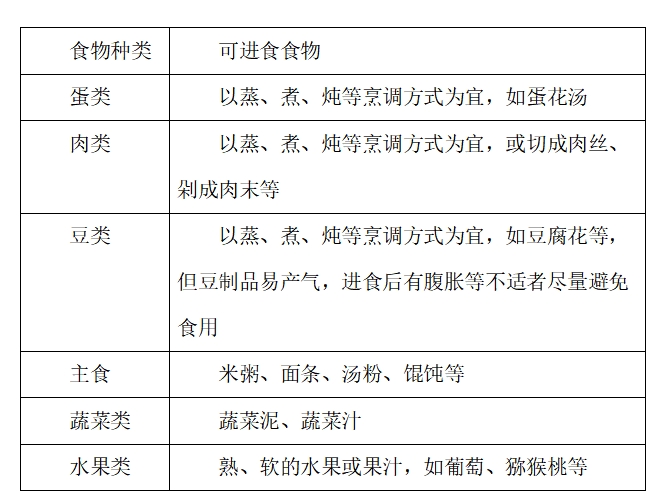 软食:易消化、易咀嚼;食物碎、烂、软;少油腻、少粗纤维及强烈刺激性调料。