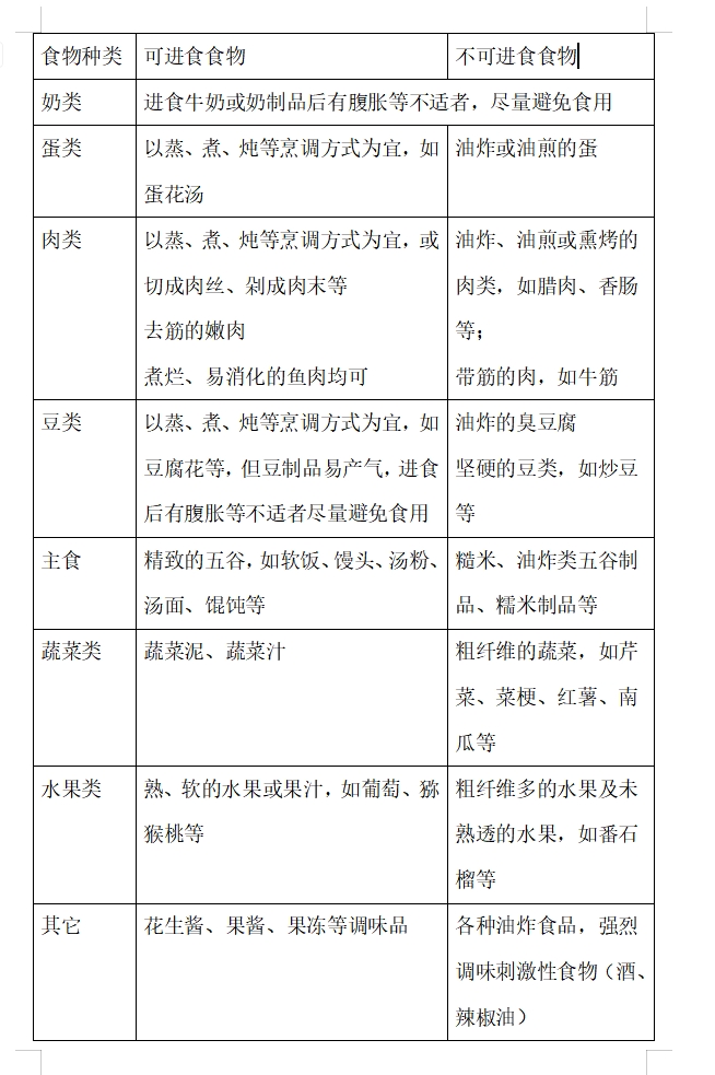 普通饮食:直到手术后第20天左右可进食普食(一般食物都可采用,但忌烟、酒、浓茶、辛辣、烟熏、油炸刺激性食物)。
