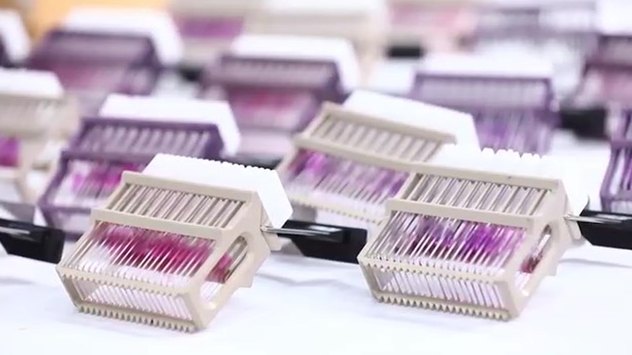 病理技师使用融化的蜡液,将脱水后的组织包埋起来,冷却后成为一个个蜡块。组织在蜡块中可以长期保存。之后,蜡块被夹持在切片机上,切成只有0.003mm的超薄蜡片。薄如蝉翼的蜡片被转移到玻璃片上,放入染色机中进行伊红-苏木素染色。