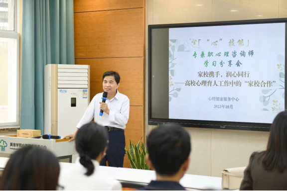 “大学生出现心理问题人员不断上升,给学校、家庭和社会造成了沉重负担。”郭平以“大学生心理问题的识别及家校共育方案”为主题,结合现实生活列举了大量生动的事例,通过案例分析给出解决办法,让老师们意识到心理健康对于大学生的重要性,在学习和生活中努力提高自己的心理健康水平,做一个阳光、积极、上进的青少年。