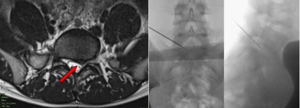 16岁的体校生小李,反复腰痛伴左下肢麻痛5月余,经系统保守治疗无效,入院前1周左下肢麻痛明显加重,无法正常上学。腰椎MR显示腰5/骶1椎间盘向左后突出,骶1神经根被卡压。考虑到患者是一名16岁的体校学生,如果采用常规的开放手术融合内固定治疗,则意味着患者体校生涯的结束,如果采用常规的孔镜辅助下微创摘除椎间盘,因为术中要切断纤维环,术后需要长时间的休息,将严重影响学业,也容易复发。根据病情及个人愿望,利用斜面入针法克服了高髂嵴及骨盆骨骺线未闭合等不利因素,精准施治,对患者实施了腰5/骶1椎间盘低温等离子髓核消融成形术。手术只需局麻,术中患者全程清醒,与医生交流自如,术后症状消失,穿刺口极微小,患者对治疗效果十分满意。