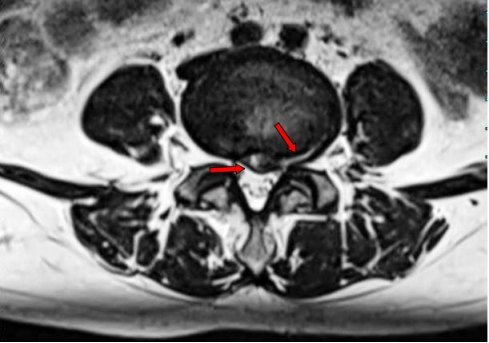 术后3个月复查腰椎MRI,对比相同节段相同层面的图像,可见纤维环回缩明显,局部侧隐窝狭窄减轻,椎管狭窄减轻。