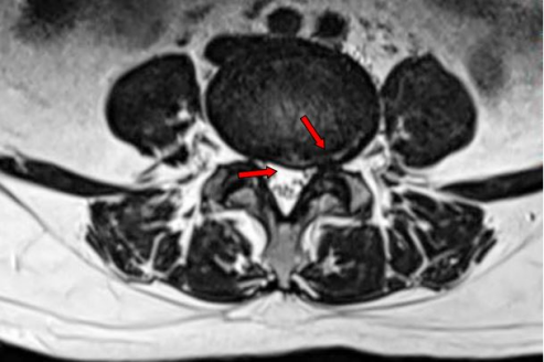 术前腰椎MR 可见腰4/5椎间盘中央偏左后突出,左后侧纤维环严重变薄,仅剩最外层纤维环完整。左侧侧隐窝狭窄,相应节段神经根受压。