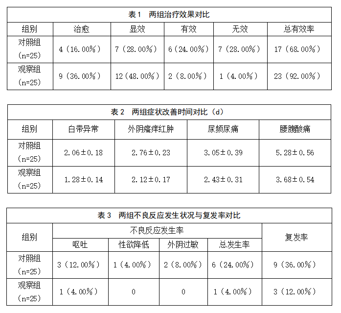 (2)症状改善时间。包括白带异常、外阴瘙痒红肿、尿频尿痛、腰腹酸痛。