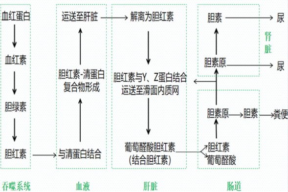 正常人每天可生成250—350mg胆红素,其中约80%以上来自衰老红细胞破坏所释放的血红蛋白。血红蛋白会分解为珠蛋白和血红素,血红素被降解为胆红素,经过肝脏代谢,随着胆汁排入小肠。