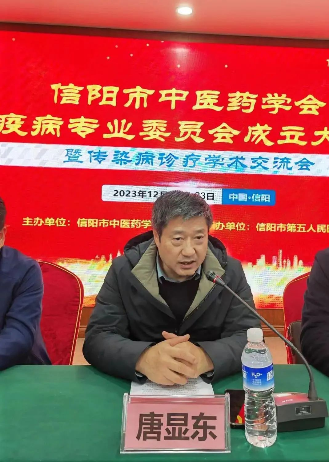 信阳市卫健委三级调研员唐显东对疫病专业委员会成立表示祝贺,并提出相关要求:一是把握办会方向;二是加强自身能力建设;三要加强培训交流;四是积极履行社会责任;五要加强与省级学会的沟通联系。