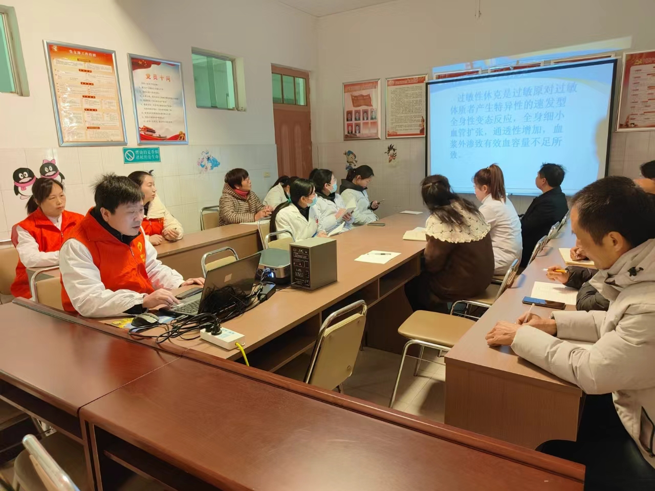 党员们为基层卫生院人员带来了一堂生动实用的课程。培训以“过敏性休克”和“孕产妇营养”为主题,用通俗易懂的语言,深入浅出地讲解了过敏性休克的识别与处理方法;还针对孕产妇营养问题,分享了科学饮食、合理搭配等实用建议,为基层医护人员提供了宝贵的临床指导。