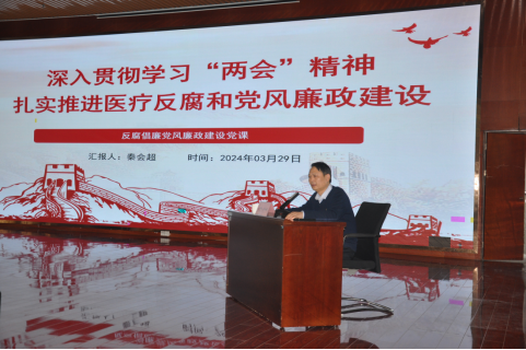 为持续强化医院党风廉政和行风建设工作,不断提升医务人员法律意识、安全意识和廉洁意识,筑牢防腐、反腐防线。医院党委书记、院长秦会超分别从2024政府工作报告中涉及的医疗健康工作要点、2023年国家医药反腐背景及2024年医药反腐典型案例等五个方面,为全体党员上了一场《深入学习贯彻“两会”精神扎实推进医疗反腐和党风廉政建设》的廉政党课。