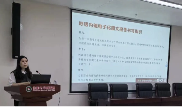 在质控培训会上,杨会珍为大家解读了《河南省电子化呼吸内镜图文报告书写指引(试行)》。提高呼吸内镜图文报告规范率作为2024年呼吸内科质量控制改进目标,具有十分重要的意义。目前,呼吸内镜电子化图文报告系统尚未普及,缺乏结构化报告模板,不利于呼吸内镜的质量管理与控制指标的提取。通过杨会珍主任的解读,使大家明确了呼吸内镜图文报告系统的规范要求。